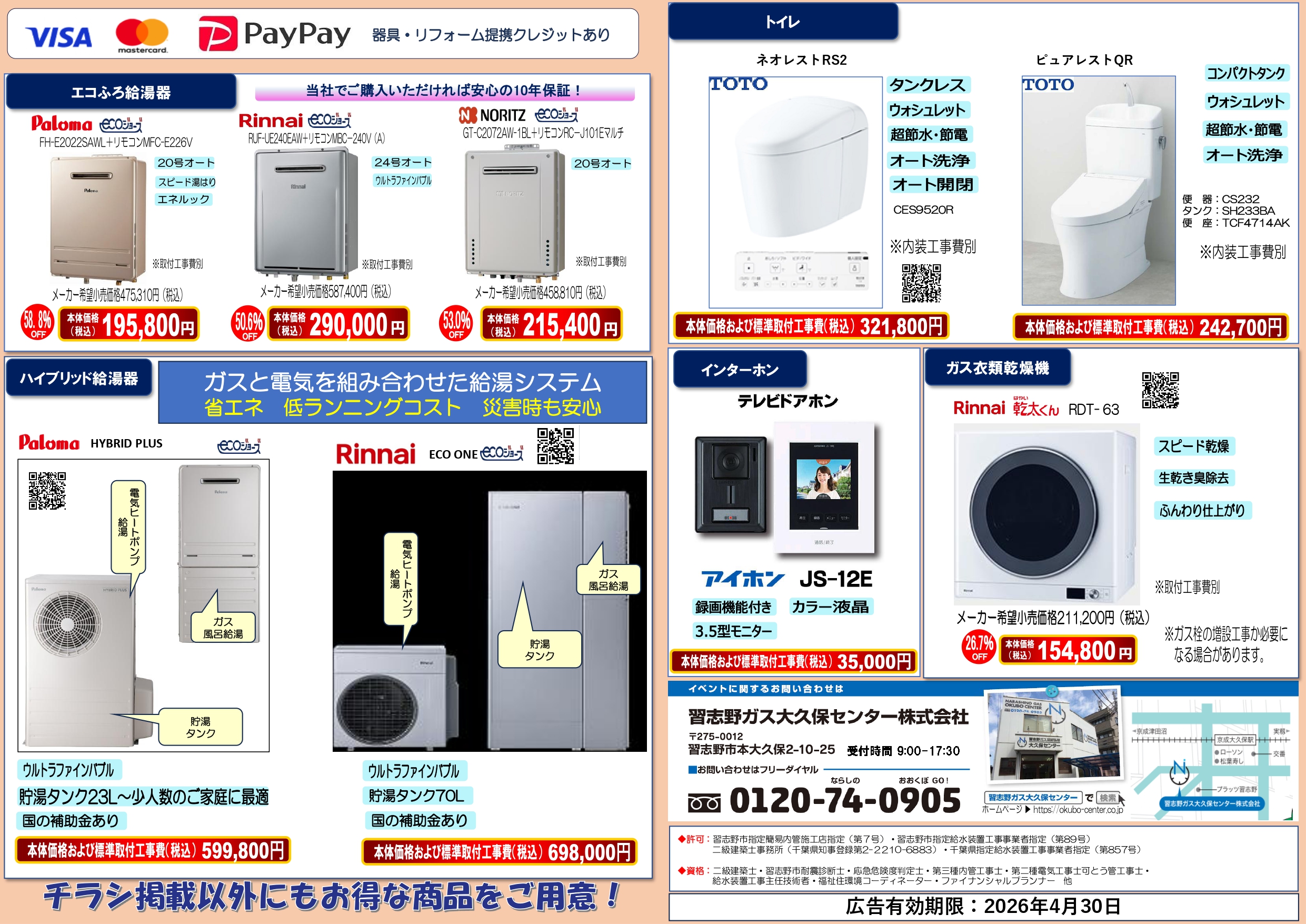 ☆ガス器具の種類によっては納品に時間をいただく場合がございます。